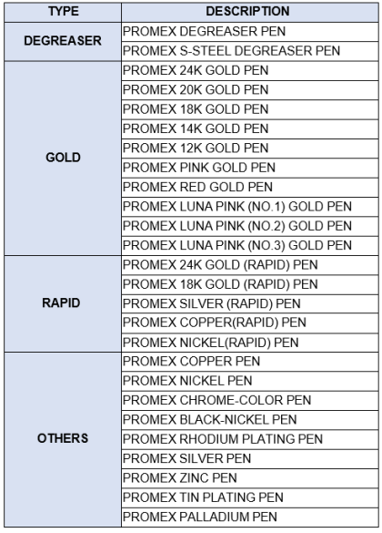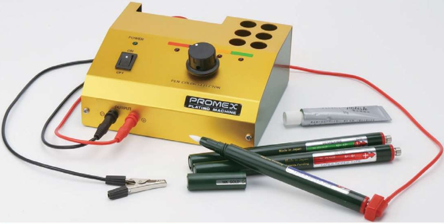 Promex Plating Machine enables you to plate safely & quickly with disposable pens (23 kinds). Each pen contains 10ml of solutions and can plate approximately 60 x 60cm plate. This compact Promex Plating Machine is perfectly suitable for Jewelry, optical frames, watches, ornaments, accessories, small parts, or jewelry maintenance and repair. 24K, 18K pen are also used for IC Based for repairing purpose.